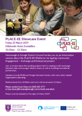 Fermanagh and Omagh District Council invite you to the first PLACE-EE showcase event on 22nd March 2019 in the Killyhevlin Hotel, Enniskillen. Here you will have the opportunity to meet key partners and participants from PLACE-EE and learn how this intergenerational project is building connections and improving access to services in communities across Europe.